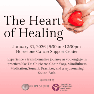 The Heart of Healing is a collaborative workshop event sponsored by Hopestone Cancer Support Center and Samaritan Counseling. It will take place on Saturday, January 31, from 9:30 AM to 12:30 PM at Hopestone, 206 SE Frank Phillips, in Bartlesville.
